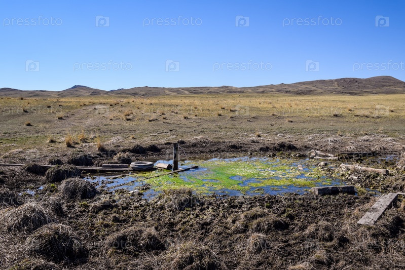 Артезианская скважина. Водопой. Древние горы Хакасии. Сахсыр