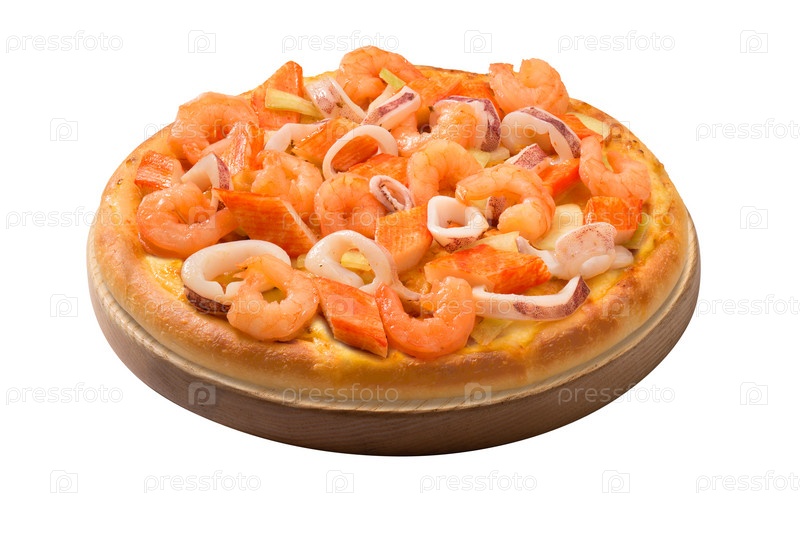 Вкусный кусок пиццы с морепродуктами, изолированный на белом