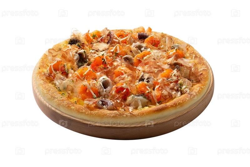Кусочек пиццы с морепродуктами на белом фоне