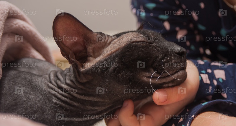 Кошка породы сфинкс темного окраса нежится в ласках человека