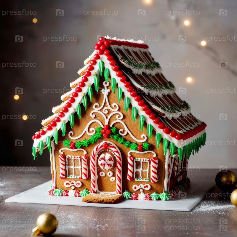 Празднично украшенный пряничный домик, украшенный разноцветной глазурью и сладостями