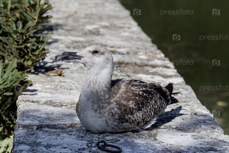 Большой морской чайка (Larus marinus) на каменном заборе у озера