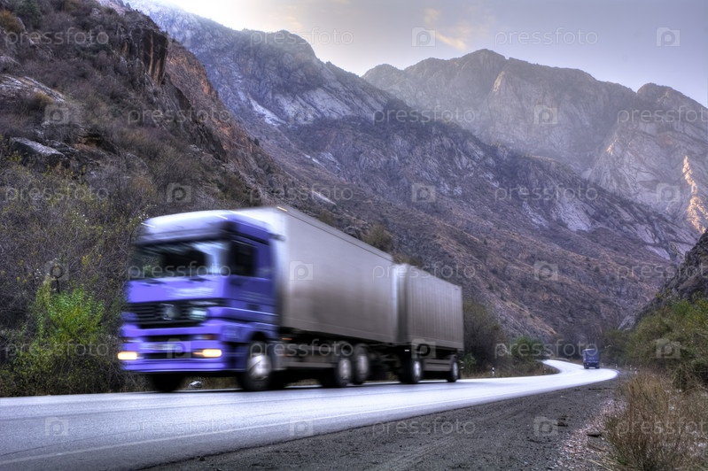 Грузовик едет по горной дороге с размытым фоном Кыргызстан