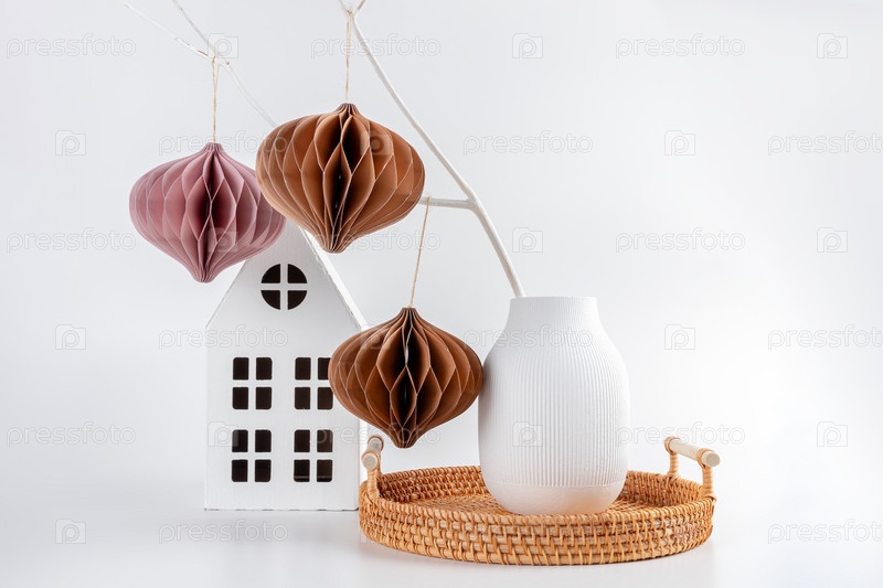 Рождественский декор в виде бумажного шара. Рождественский декор в скандинавском стиле, сделанный своими руками на белом фоне у стены. Дизайн в стиле бохо, скандинавский. Сделай сам. Минимальный орнамент. Структурное оригами. Ноль отходов