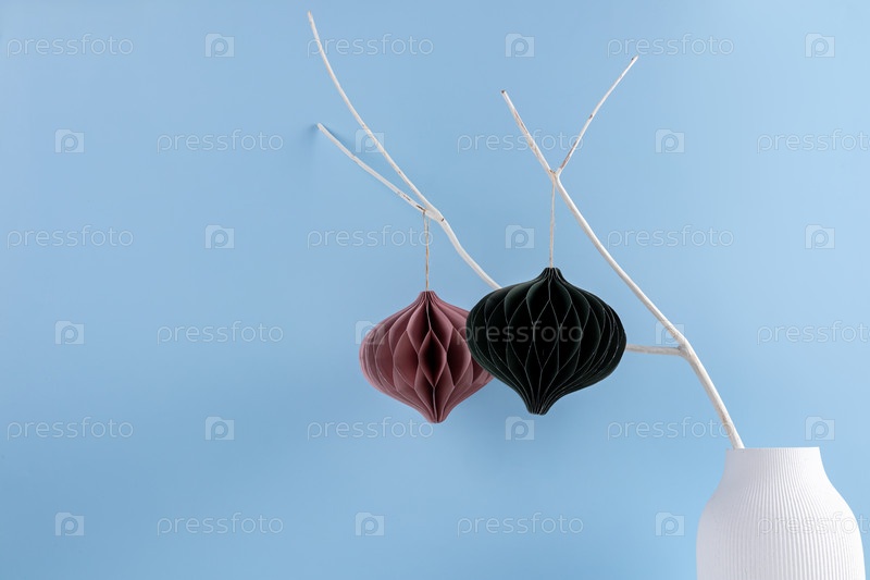 Рукодельные клетчатые шарики висят на ветке дерева. Красивое рождественское украшение для дома. Скандинавская концепция Nordic Craft Paper. Копировать пространство