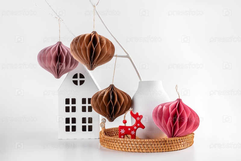 Скандинавские рождественские бумажные соты. Современные рождественские украшения, минималистичные и без пластика ветка с игрушками на белом фоне