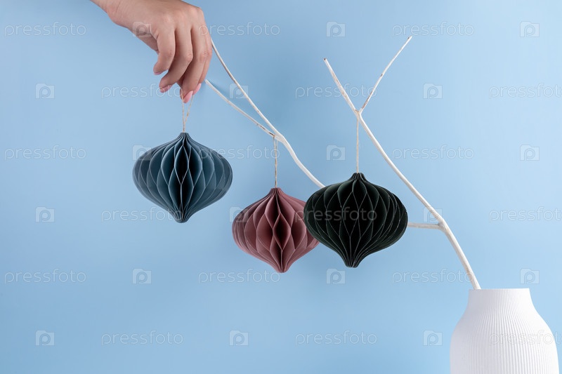 Скандинавские рождественские бумажные соты на белой ветке на синем фоне. Стиль минимализма