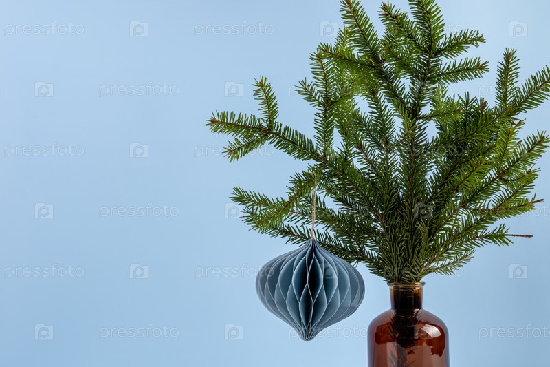 Скандинавские рождественские украшения с бумажными сотовыми орнаментами на ветвях вечнозеленых растений на синем фоне - праздничный дизайн для открыток и плакатов