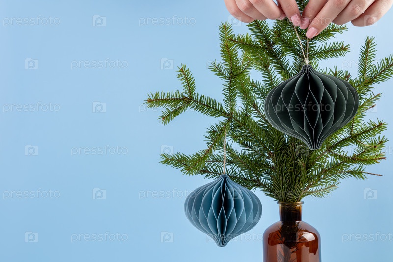 Рождественский декор в виде бумажного шара. Скандинавское рождественское украшение ручной работы на синем фоне. Богемный и скандинавский дизайн. Домашнее и экологичное украшение