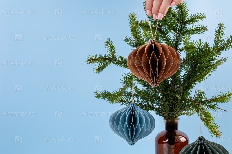 Рождественская бумажная безделушка висит на ветке ели на синем фоне. Новогодний декор из бумаги, баннер в минималистичном стиле, зимние праздники, место для копирования