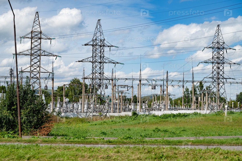 Электроподстанция с высоковольтными башнями и кабелями в сельской местности, под голубым небом с облаками. Концепция энергетической инфраструктуры