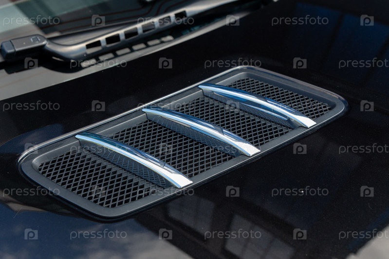 Крупный план хромированных воздухозаборников на капоте черного автомобиля
