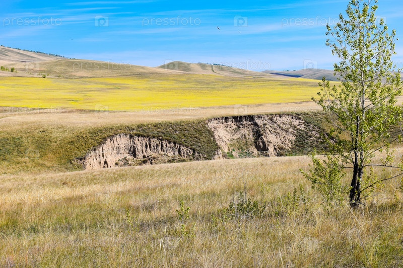 Овраг, пейзаж, зеленая трава, синее небо, сухая чея,