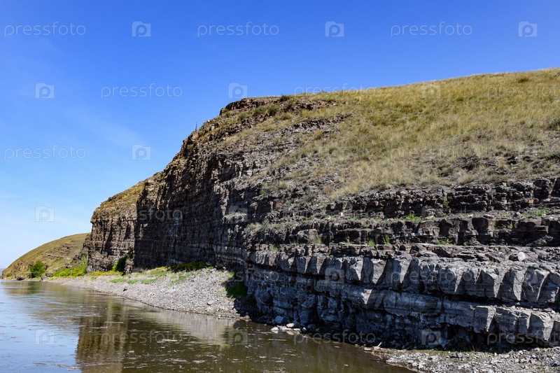 Горный пейзаж, зеленая трава, синее небо, река, берег
