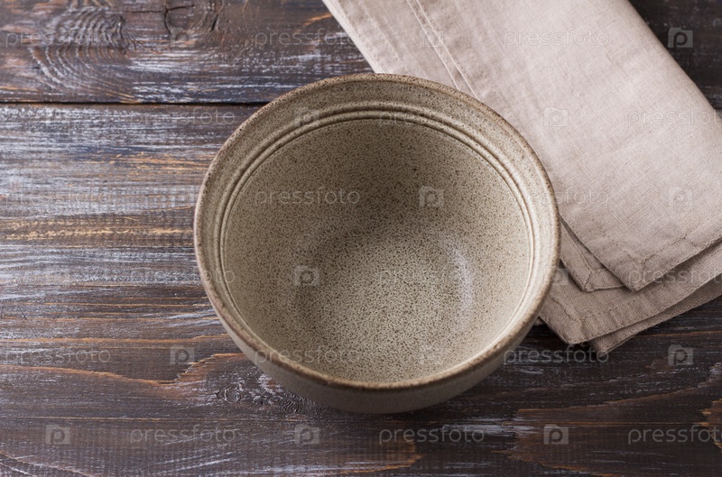 Простая пустая бежевая керамическая миска на деревянном столе, деревенский стиль, макет, для графического дизайна, творчества