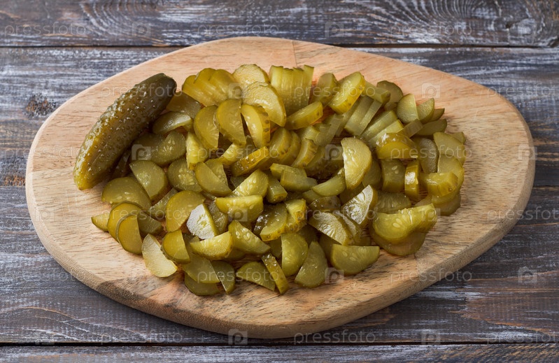 Ломтики маринованных огурцов на деревянной доске на деревянном столе, деревенский стиль, вид сверху