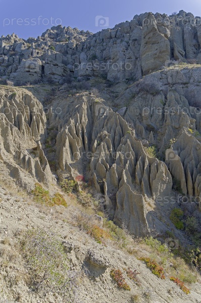 Причудливый рельеф, возникший на глиняном склоне у подножья мыса Меганом в результате эрозии и выветривания. Крым. Середина октября, солнечно