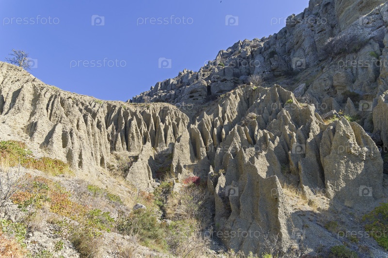Причудливый рельеф, возникший на глиняном склоне у подножья мыса Меганом в результате эрозии и выветривания. Крым. Середина октября, солнечно
