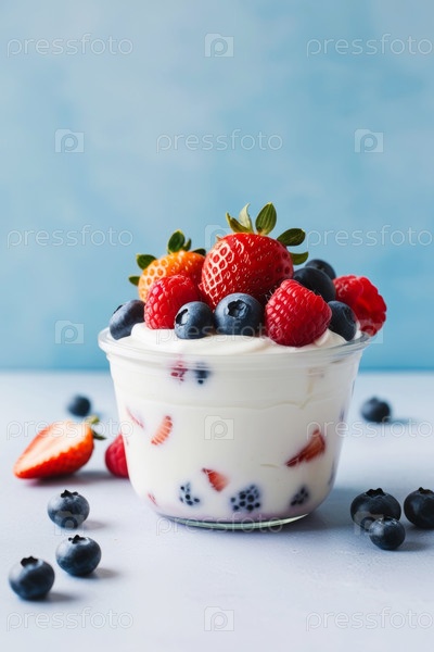 Вкусный ягодный йогурт в прозрачной миске со свежей клубникой, малиной и черникой на светло-голубом фоне