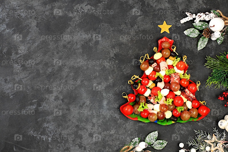 Рождественские и новогодние блюда, набор закусок для праздничного стола. Тарелка с елкой из помидоров, паштета, сыра моцарелла, салями, оливок, маслин и винограда на бетонном столе,
