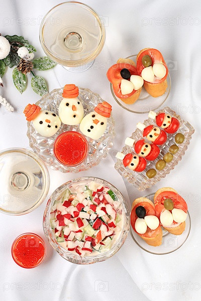 Рождественские новогодние блюда, концепция детокс-диеты, квашеная капуста, традиционный овощной салат из огурцов, помидоров и редиса, соленые огурцы и брускетта капрезе, здоровый образ жизни и концепция здорового питания,