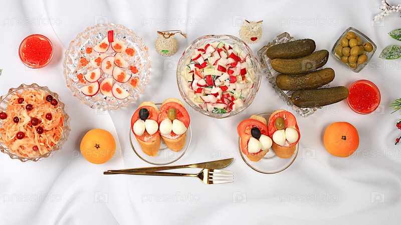 Рождественские новогодние блюда, концепция детокс-диеты, квашеная капуста, традиционный овощной салат из огурцов, помидоров и редиса, соленые огурцы и брускетта капрезе, здоровый образ жизни и концепция здорового питания