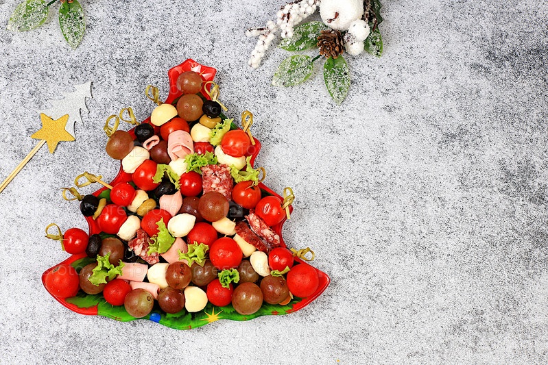 Рождественские и новогодние блюда, набор закусок для праздничного стола. Тарелка с елкой из помидоров, паштета, сыра моцарелла, салями, оливок, маслин и винограда на бетонном столе,