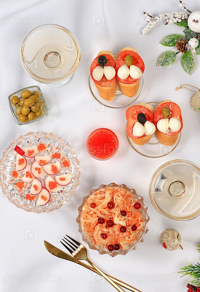 Рождественские новогодние блюда, канапе и брускетты, традиционный салат из капусты с клюквой, овощной салат из огурцов, помидоров и редиса и различные овощные закуски, праздничная концепция подачи,