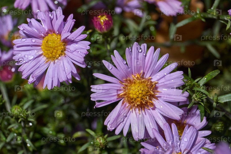 Астра многолетняя утром после первых заморозков в саду. род травянистых растений семейства Астровые (Asteraceae). 3 ноября 2024 г