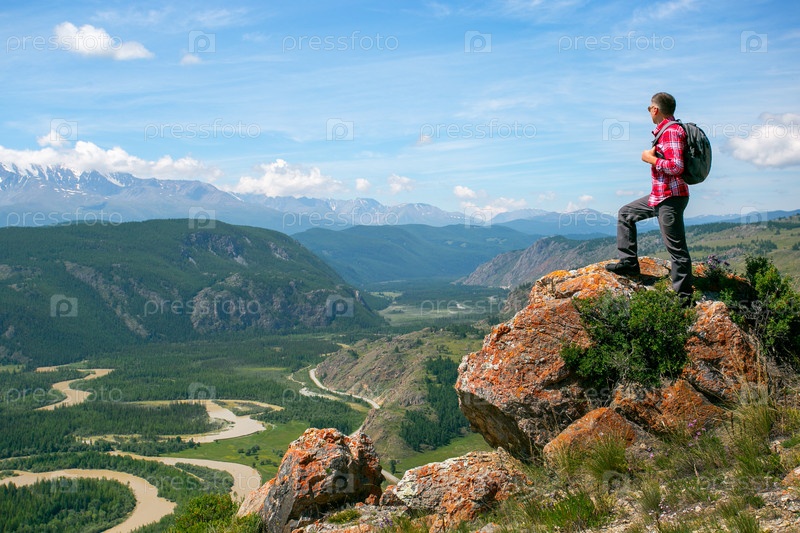 Турист с рюкзаком отдыхает на вершине горы и наслаждается видом на долину