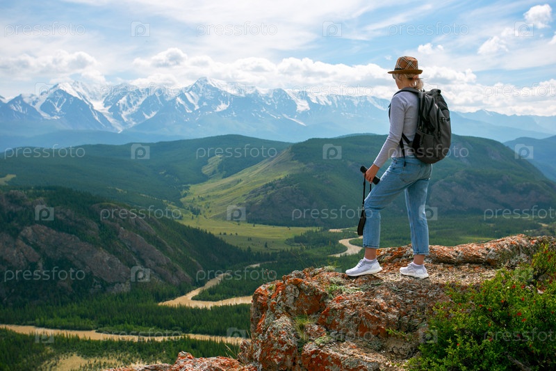 Женщина-туристка держит бинокль на вершине скалистой горы с видом на долину