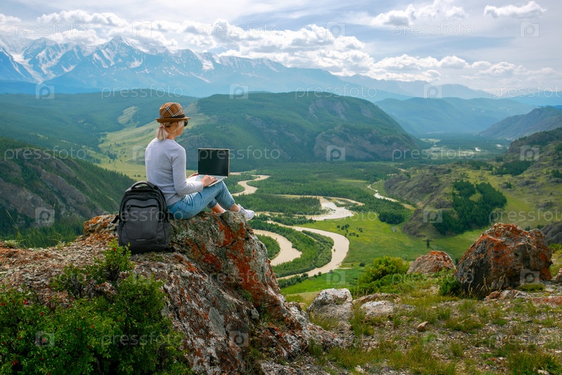 Женщина работает удаленно на горном хребте в летний прекрасный день
