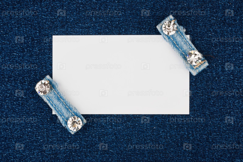 Визитная карточка с двумя бретелями, джинсы со стразами, лежит на джинсовой ткани