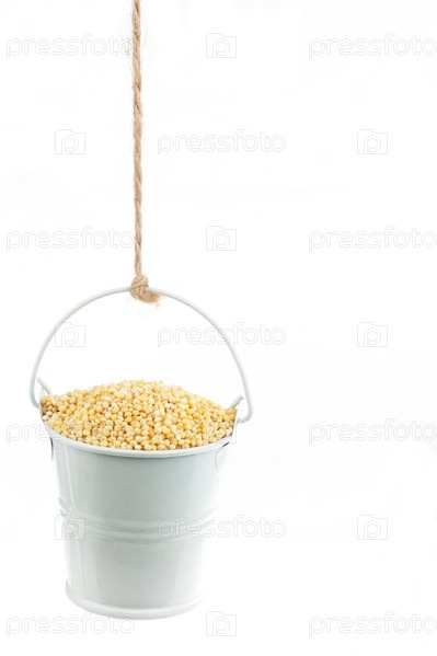 Полное ведро зерен проса, висящее на веревке