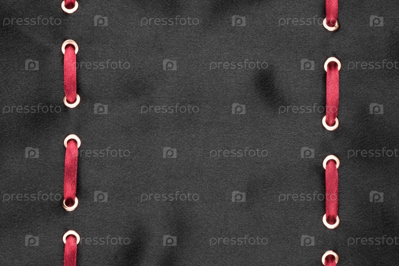 Красная атласная лента, вставленная в золотые кольца на черном шелке. Вид сверху