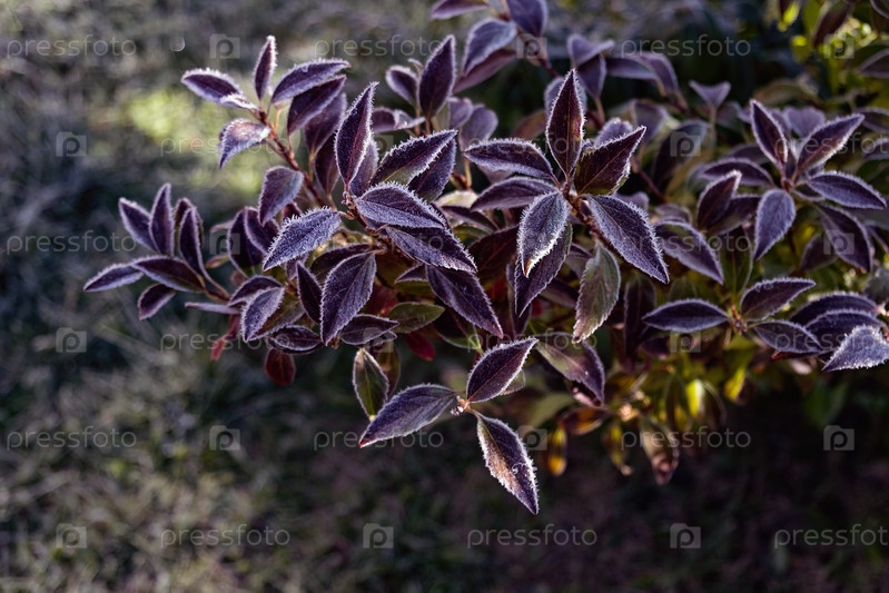 Замороженные листья в природе. Крупный план замороженных листьев ярких цветов на размытом зеленом фоне