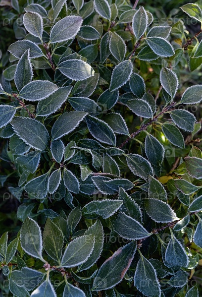 Замороженные листья в природе. Крупный план замороженных листьев ярких цветов на размытом зеленом фоне. Вертикальное кадрирование