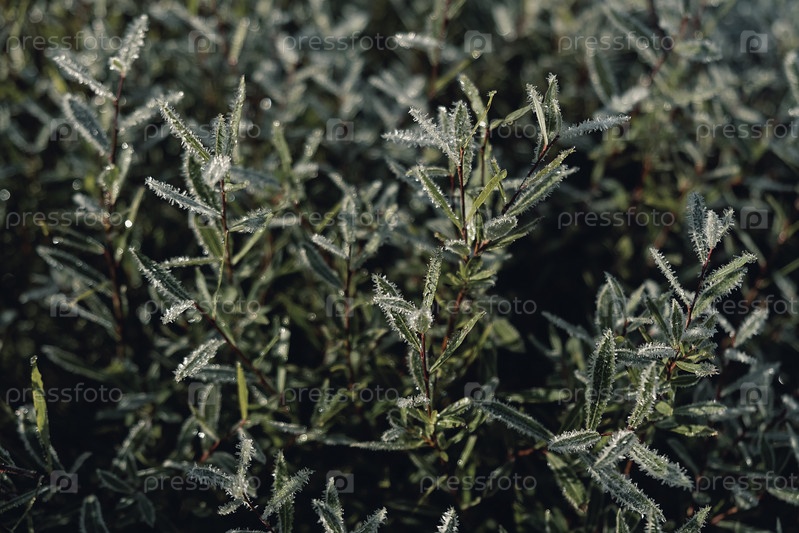 Замороженные листья в природе. Крупный план замороженных листьев ярких цветов на размытом зеленом фоне