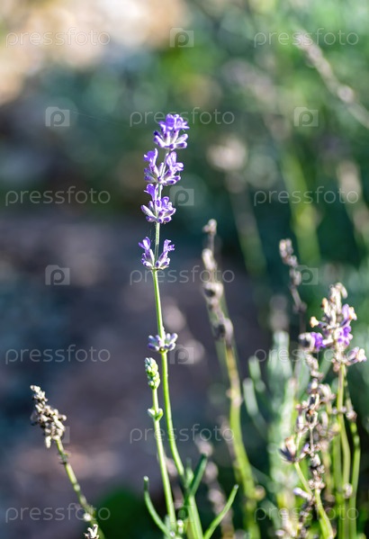 Крупный план нежного цветка лаванды в полном расцвете, возвышающегося среди зеленой листвы. Вертикальное кадрирование. Копировать пространство