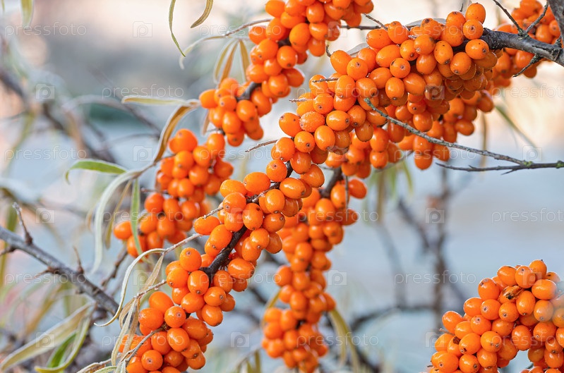 Оранжевые ягоды спелой облепихи покрыты инеем. Крупный план