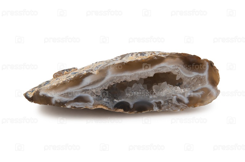 Осколок минерала халцедоновой жеоды, полупрозрачно-коричневого цвета с белыми прожилками