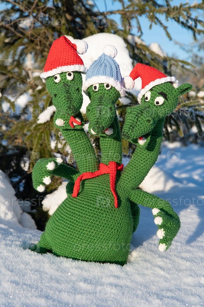Трехголовый дракон в новогодней шапочке и красном шарфе, связанный из зеленой пряжи