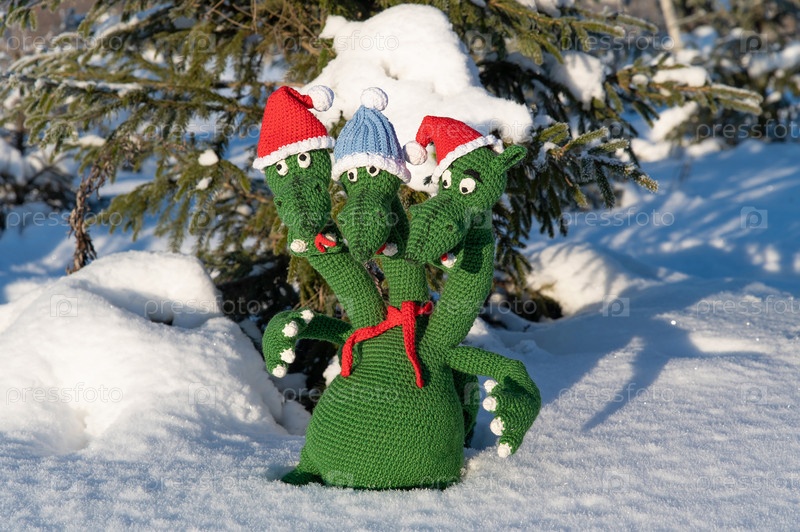 Трехголовый дракон в новогодней шапочке и красном шарфе, связанный из зеленой пряжи