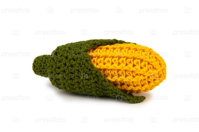 Вязаный кукурузный початок с зелеными листьями, связанный из толстой пряжи