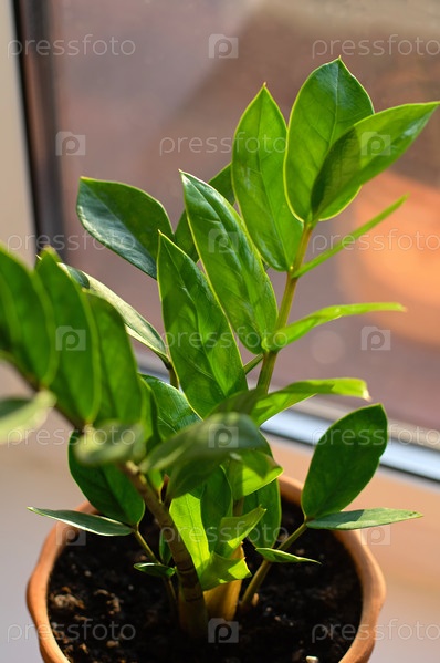 Растение замиокулькас ярко-зеленого цвета в горшке. Вечнозеленое растение как декор для офиса или дома. Крупный план. Вертикальная культура