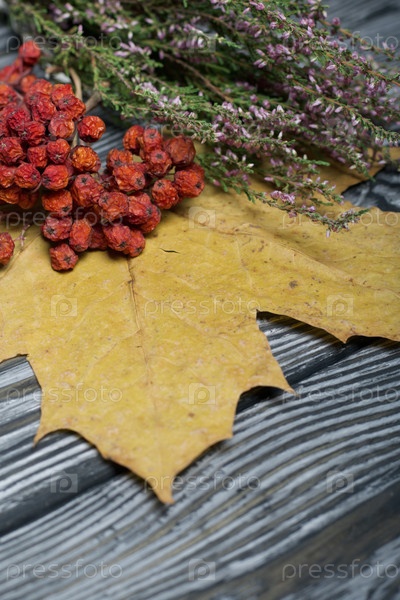 Желтые осенние кленовые листья, пучок сухого вереска и сухие ягоды рябины. На сосновых досках, окрашенных в черный и белый цвета