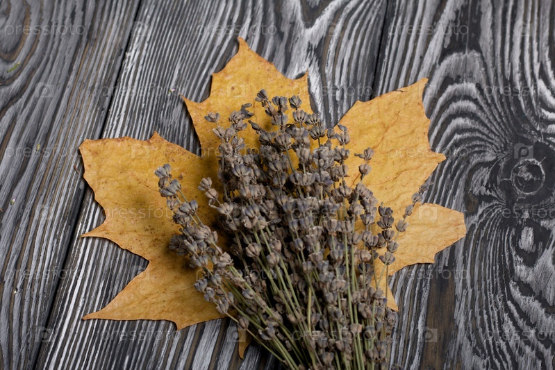Букет сухой лаванды на осенних желтых кленовых листьях. На сосновых досках, окрашенных в черный и белый цвета