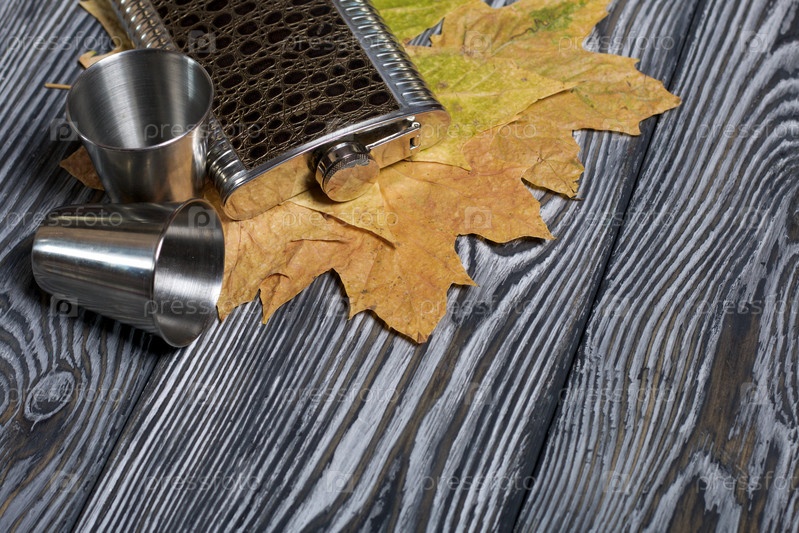 Фляга для алкогольного напитка и металлические стаканы. Осенние кленовые листья желтые. На сосновых досках, окрашенных в черный и белый цвета