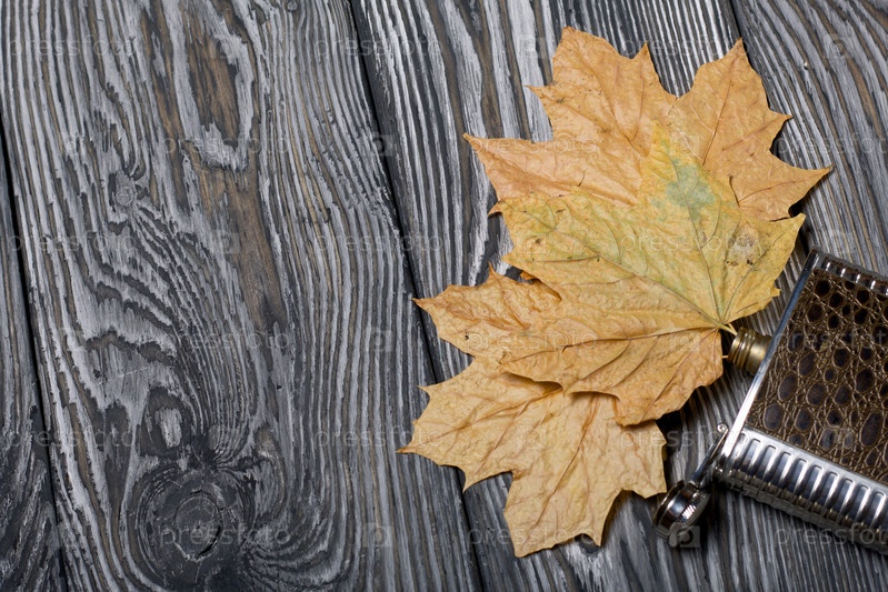 Желтые осенние кленовые листья торчат из банки для алкогольного напитка. На сосновых досках, окрашенных в черный и белый цвета