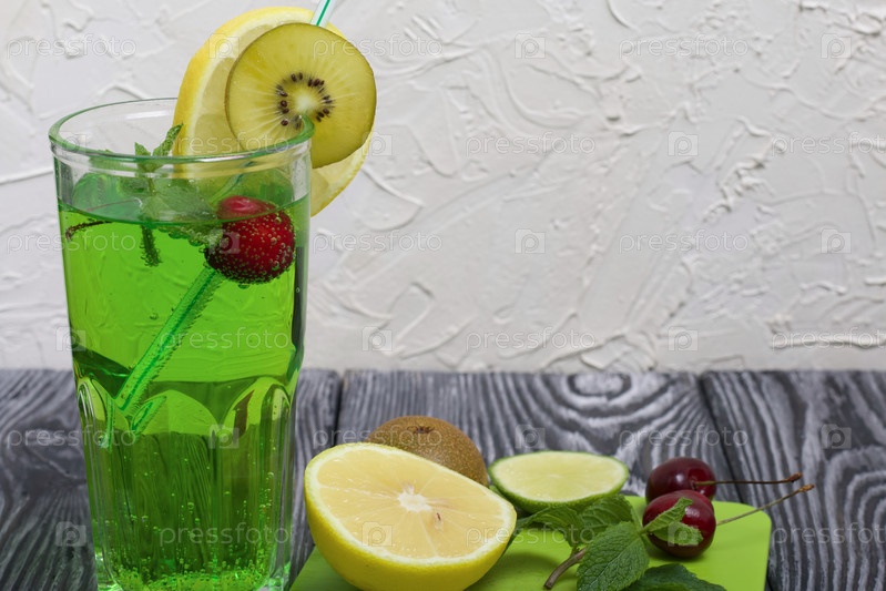 Зеленый лимонад в стакане. В нем плавают вишня и листья мяты. Украшен ломтиком лимона и киви. С соломинкой для коктейля. Рядом на разделочной доске лежат фрукты для коктейля